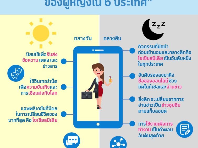10% ของกลุ่มตัวอย่างจากสวีเดนระบุถึงการซื้อของออนไลน์ช่วงมิดไนท์เซล ผู้หญิงชาวนอร์เวย์และเมียนมาร์นิยมอ่านข่าวเป็นกิจกรรมหลักก่อนเข้านอน โดย 1 ใน 5 ของผู้หญิงชาวนอร์เวย์ยอมรับว่าเปลี่ยนจากการอ่าน “ข่าว” มาเป็น “ข่าวซุบซิบตามแท็บลอยด์” เมื่อเวลายิ่งดึก ส่วน “การใช้งานเพื่อการทำงาน”เป็นเป็นคำตอบอันดับสุดท้ายของผู้หญิงในทุกประเทศ