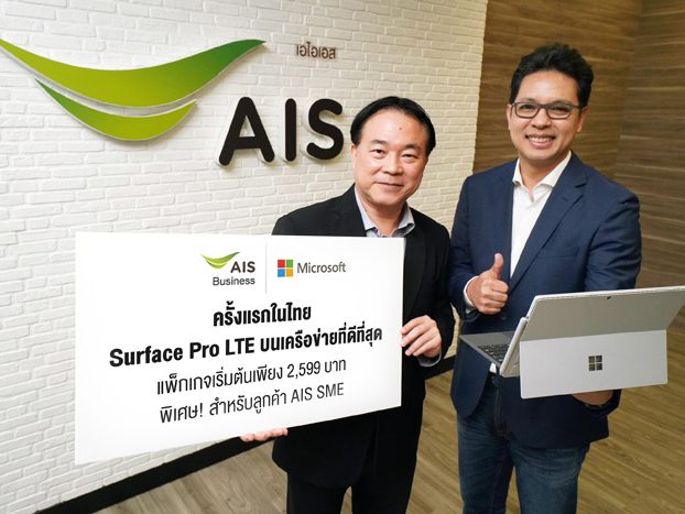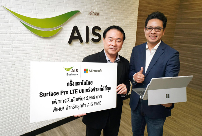 AISxMicrosoft-1เอไอเอส โดยนายยงสิทธิ์ โรจน์ศรีกุล หัวหน้าคณะผู้บริหารกลุ่มลุกค้าองค์กร ร่วมกับบริษัท ไมโครซอฟท์ (ประเทศไทย) โดยนายธนวัฒน์ สุธรรมพันธุ์ กรรมการผู้จัดการ ในฐานะเอ็กคลูซีฟพาร์ทเนอร์ ส่งมอบประสบการณ์ใหม่แห่งนวัตกรรมแล็ปท็อปสุดล้ำที่คนไทยรอคอย Surface Pro LTE เป็นอย่างทางการ ครั้งแรกในเมืองไทย เพื่อตอบสนองการใช้งานของลูกค้ากลุ่มธุรกิจและผู้ประกอบการยุคใหม่ ได้ใช้ประโยชน์ในการทำงานและไลฟ์สไตล์ส่วนตัวได้อย่างคล่องตัวกว่าเคย ซึ่งเป็นรุ่นที่สามารถใส่ซิมการ์ดและใช้งานอินเทอร์เน็ตบนเครือข่ายที่ทรงประสิทธิภาพได้อย่างสะดวกสบายทุกที่ทุกเวลา โดยวางจำหน่ายสำหรับลูกค้ากลุ่มธุรกิจของเอไอเอสเท่านั้น ด้วยข้อเสนอพิเศษในรูปแบบแพ็กเกจรายเดือนแบบผูกสัญญา 24 เดือน มีให้เลือก 2 รุ่น ได้แก่