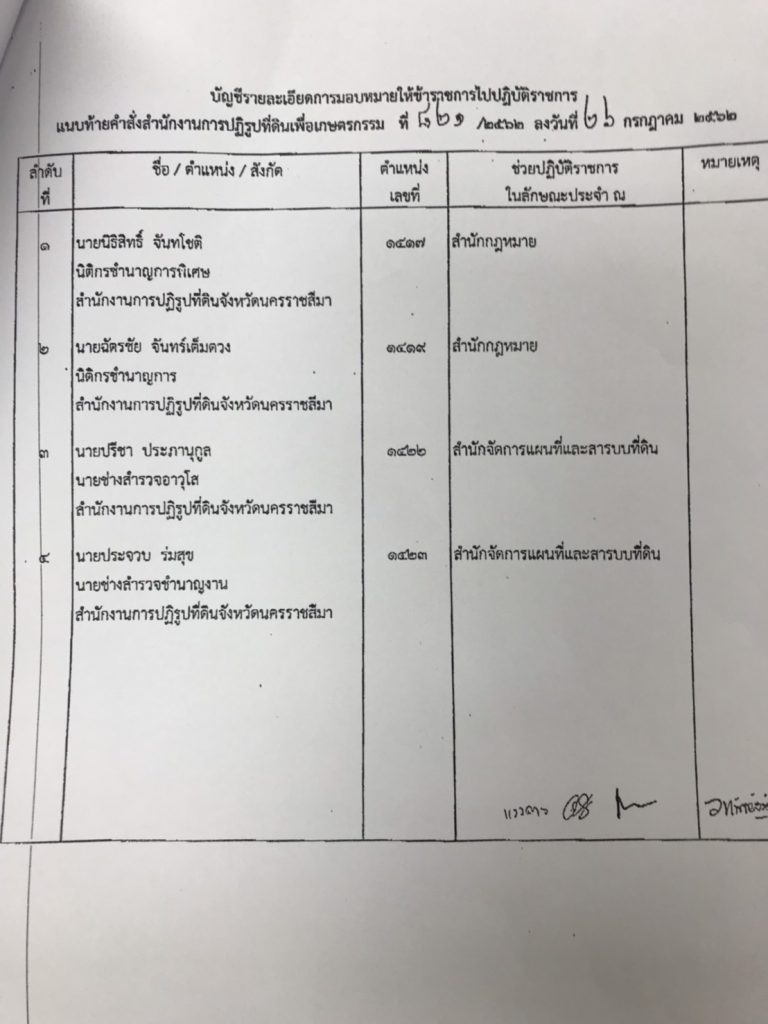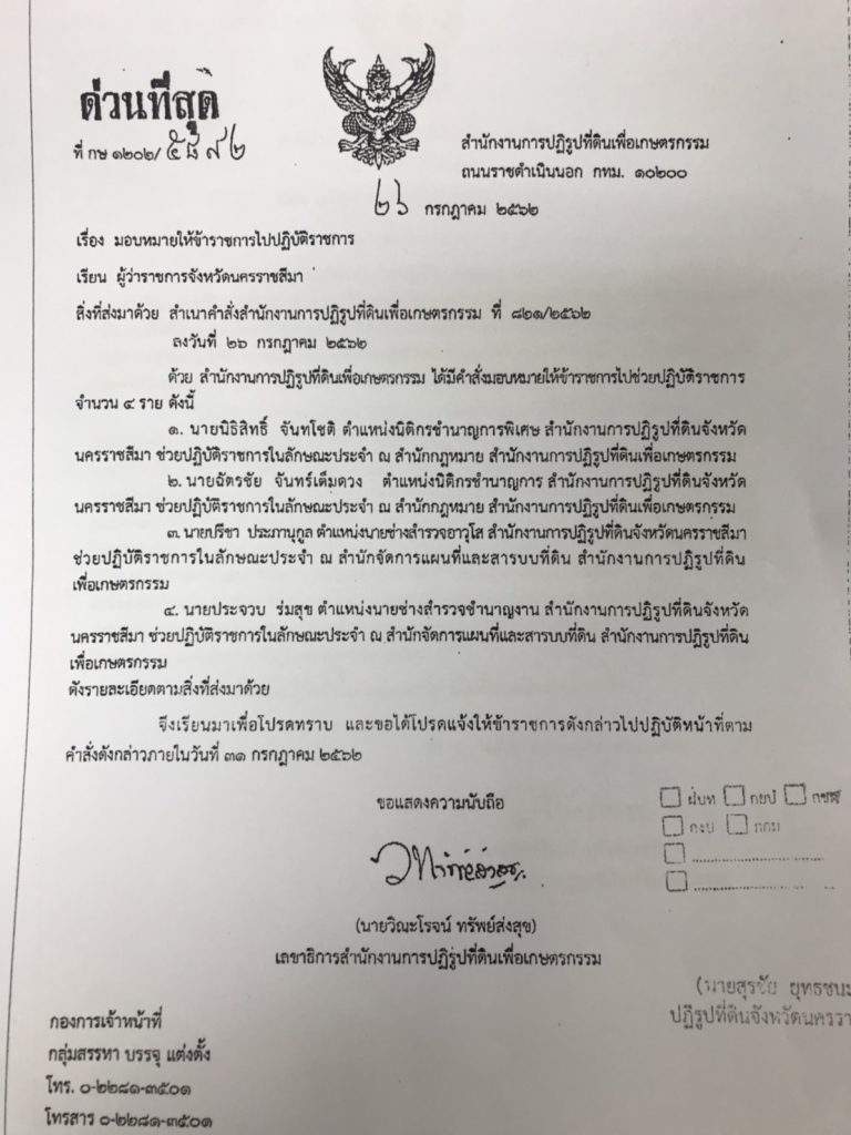 พร้อมกันนี้ ทาง ส.ป.ก. โดย นายวิณะโรจน์ ทรัพย์ส่งสุข เลขาธิการ ส.ป.ก. ได้มีหนังสือด่วนที่สุด ที่ กษ 1202/2892 ลงวันที่ 26 ก.ค. 2652 เรื่อง มอบหมายให้ข้าราชการไปปฏิบัติราชการ เรียน ผู้ว่าราชการจังหวัดนครราชสีมา เพื่อแจ้งกรณีมีคำสั่ง ส.ป.ก. ให้ข้าราชการ สำนักงานปฏิรูปที่ดินจ.นครราชสีมา ไปช่วยราชการจำนวน 4 รายดังกล่าวด้วย