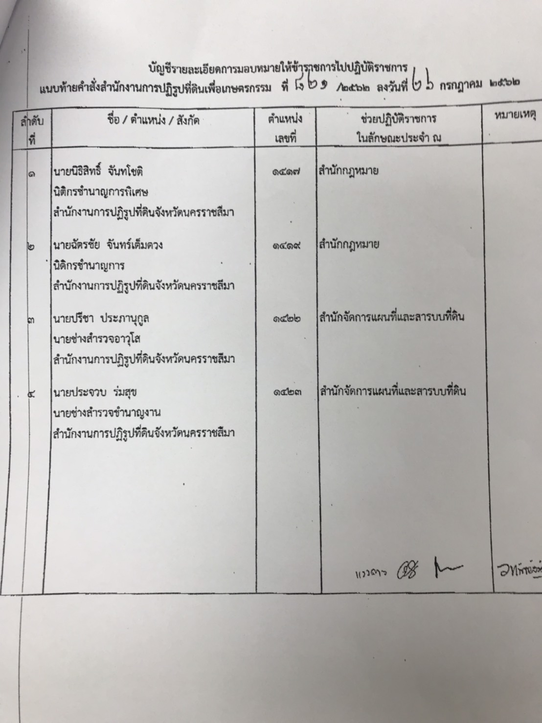 ฉะนั้น อาศัยอำนาจตามมาตรตรา 36 แห่งพระราชบัญญัติ ระเบียบบริหารราชการแผ่นดิน พ.ศ. 2534และที่แก้ไขเพิ่มเติม จึงมอบหมายให้ข้าราชการของสำนักงานการปฏิรูปที่ดินจังหวัดนครราชสีมา ช่วยปฏิบัติราชการในลักษณะประจำ ณ สำนักกฎหมาย และสำนักจัดการแผนที่และสารบบที่ดิน สำนักงานปฏิรูปที่ดินเพื่อเกษตรกรรม จำนวน 4 ราย ดังนี้