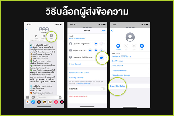 โดยเข้าไปที่เมนูข้อความ → เปิดการสนทนา → แตะผู้ติดต่อที่ด้านบนของการสนทนา → แตะ i → แตะชื่อ หมายเลขโทรศัพท์ หรือ ที่อยู่อีเมล เลื่อนไปที่ด้านล่างสุดของหน้าจอ แล้วแตะปิดกั้น