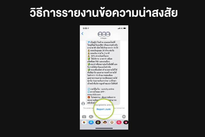 ทั้งนี้ แนะนำให้กดรายงาน (Report) iMessage ที่มีลักษณะเข้าข่ายสแปมหรือข้อความขยะ หากได้รับจากบุคคลที่ไม่ได้ถูกบันทึกอยู่ในแอปฯ รายชื่อ โดยเมื่อเข้าไปที่เมนูข้อความ → เปิดการสนทนา → จะเห็นลิงก์ “แจ้งว่าเป็นขยะ” ภายใต้ข้อความ → แตะแจ้งว่าเป็นขยะ → แตะลบและแจ้งว่าเป็นขยะ จากนั้นแอพข้อความจะส่งต่อข้อมูลและข้อความของผู้ส่งไปยัง Apple และลบข้อความออกจากอุปกรณ์ของท่าน