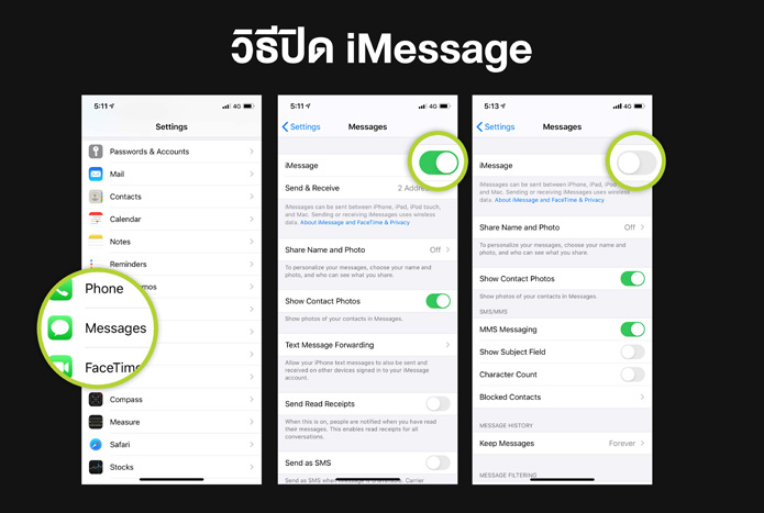 โดยเข้าไปที่เมนูตั้งค่า → เลือกข้อความ → เลื่อนแถบปิดที่เมนู iMessage