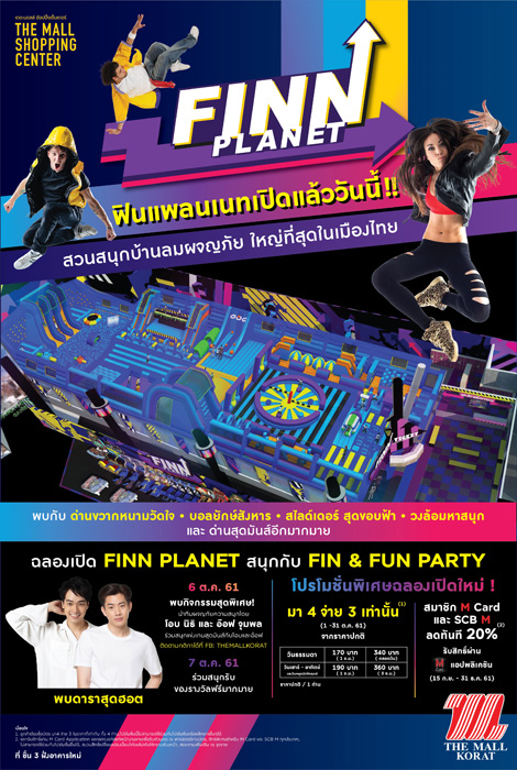 ครั้งแรกในประเทศไทย เอาใจวัยทีน เดอะมอลล์ ช้อปปิ้งเซ็นเตอร์ เปิดสุดยอดสวนสนุก “Finn Planet” บ้านลมผจญภัยที่ใหญ่ที่สุดในเมืองไทย บนเนื้อที่กว่า 1,600 ตารางเมตร เปิดประสบการณ์ความสนุกและความตื่นเต้นรูปแบบใหม่สุดเอ็กซ์ตรีมไร้ขีดจำกัด พิเศษฉลองเปิดตัว “Finn planet” ชวนเพื่อนๆ มา FINN และ FUN พร้อมให้กำลังใจดาราสุดฮอต โอบ-โอบนิธิ และ ออฟ-จุมพล ที่จะมาแข่งขันผ่านด่านผจญภัยร่วมกับเหล่าบรรดาแฟนคลับ ในวันเสาร์ที่ 6 ตุลาคม 2561 ตั้งแต่เวลา 13.30 น. เป็นต้นไป ที่ฝั่งอาคารใหม่ ชั้น 3 เดอะมอลล์ โคราช โดยแฟนคลับที่สนใจเข้าร่วมแข่งขันสามารถติดตามกติกาการเข้าร่วมแข่งขันได้ที่ FB:THEMALLKORAT