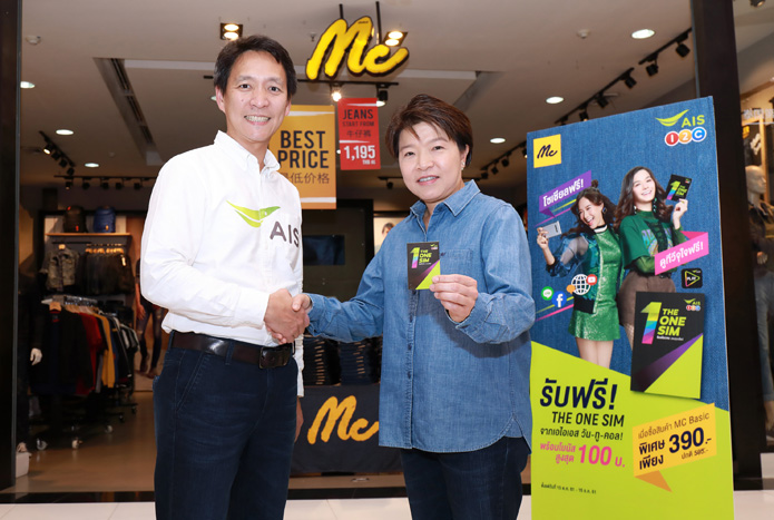 เอไอเอส จับมือ บริษัท แม็คกรุ๊ป จำกัด (มหาชน) หรือ แม็คยีนส์ ผู้นำธุรกิจค้าปลีกเครื่องแต่งกายและสินค้าไลฟ์สไตล์แบรนด์แม็คยีนส์, M&C, U-P ฯลฯ ร่วมกันจัดแคมเปญการตลาดเพื่อมอบสิทธิพิเศษให้กับลูกค้าทั้งสองบริษัทได้ช้อปปิ้งสินค้าดีมีคุณภาพและทันสมัย เติมเต็มไลฟ์สไตล์ของคนรุ่นใหม่ประเดิมด้วย การมอบสิทธิพิเศษให้ลูกค้าที่ซื้อสินค้า MC Basic (แพ็กเสื้อยืด 2 ตัว) ในราคาพิเศษเพียง 390 บาท จากราคาเต็ม 595 บาท พร้อมรับฟรี! ซิมเอไอเอส วัน-ทู-คอล! พร้อมรับเงินโบนัสสูงสุด 100 บาท ณ ร้านแม็คยีนส์ทุกสาขา และเตรียมขยายระบบรับชำระด้วย Rabbit LINE Pay ในเร็วๆ นี้ เพื่ออำนวยความสะดวกแก่สาวกแม็คยีนส์ในยุค 4.0