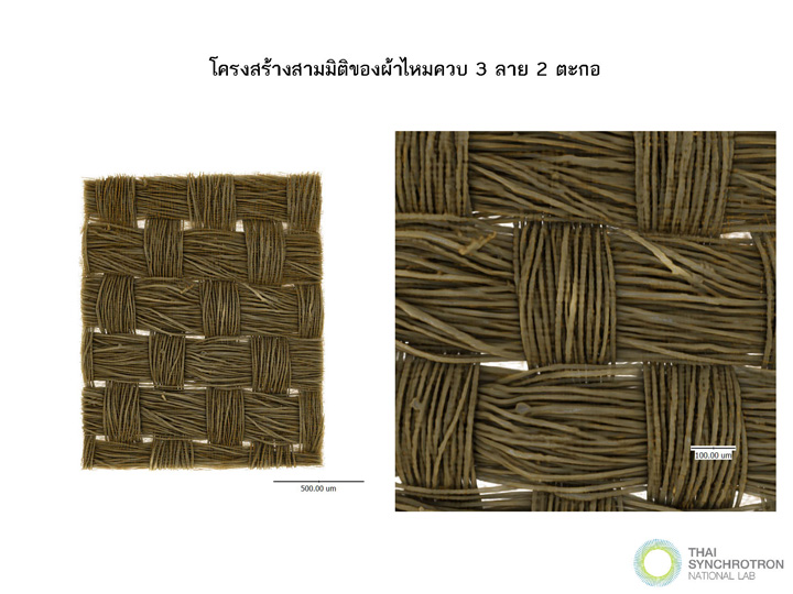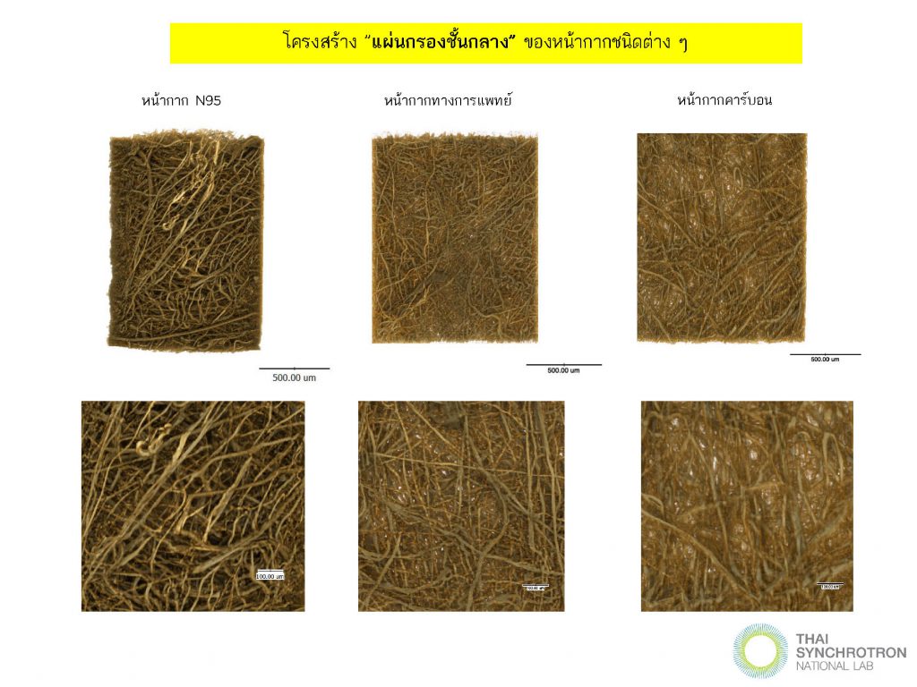 ผลการศึกษาด้วยแสงซินโครตรอน ในเทคนิค X-ray tomographic microscopy (XTM) สามารถบ่งชี้ลักษณะของเส้นใย ขนาดเส้นด้าย และรูปแบบการทอ รวมถึงการกระจายตัวของช่องว่างภายในผ้าได้แบบสามมิติ ซึ่งเป็นปัจจัยสำคัญที่กำหนดประสิทธิภาพการกรองของผ้าชนิดต่าง ๆ ผลวิเคราะห์แบบสามมิติ พบว่า ผ้าไหมธรรมชาติมีขนาดเส้นด้ายที่เล็กและยาวต่อเนื่องกว่าผ้าที่ทอด้วยเส้นใยสังเคราะห์ ทำให้รูปแบบการทอสามารถทอได้แน่นสม่ำเสมอและมีช่องว่างขนาดเล็ก ทีมวิจัยจึงนำองค์ความรู้ที่ได้ไปใช้ออกแบบรูปแบบการทอผ้าไหมให้สามารถกรองฝุ่นและแบคทีเรียได้ดีเทียบเท่ากับหน้ากากทางการแพทย์ โดยปรับเปลี่ยนขนาดเส้นไหมเป็นไหมควบ 3 เส้นและทอลายขัด 2 ตะกอ ซึ่งทดสอบแล้วพบว่าผ้าไหมนี้กรองอนุภาค PM 2.5 และ 0.3 ไมครอนได้มากถึง 85% ซึ่งดีกว่าผ้ามัสลินที่กรองได้เพียง 16-18% แต่ที่พิเศษกว่าก็คือผ้าไหมยังให้การระบายอากาศได้ดี ให้ความรู้สึกเย็นและไม่ทำให้อึดอัดหากต้องสวมใส่เป็นเวลานาน รวมถึงผลการวิเคราะห์ผ้าไหมด้วยเทคนิค in situ wide-angle X-ray scattering (WAXS) ยังพบว่าผ้าไหมมีโครงสร้างผลึกที่แข็งแรง ทนต่อแรงดึงได้ดีกว่าผ้ามัสลินที่นิยมใช้ทำหน้ากากในปัจจุบัน จึงสามารถซักและนำกลับมาใช้ซ้ำได้โดยไม่มีผลต่อโครงสร้าง นอกจากนี้ยังพบว่าในผ้าไหมมีการกระจายของตัวของซิงค์ออกไซด์ (ZnO) ในธรรมชาติ ซึ่งมีศักยภาพในการต้านเชื้อแบคทีเรียจากการวิเคราะห์โครงสร้างเคมีเชิงลึกด้วยเทคนิค X-ray absorption near edge spectroscopy (XANES) และ X-ray fluorescence spectroscopy (XRF)”