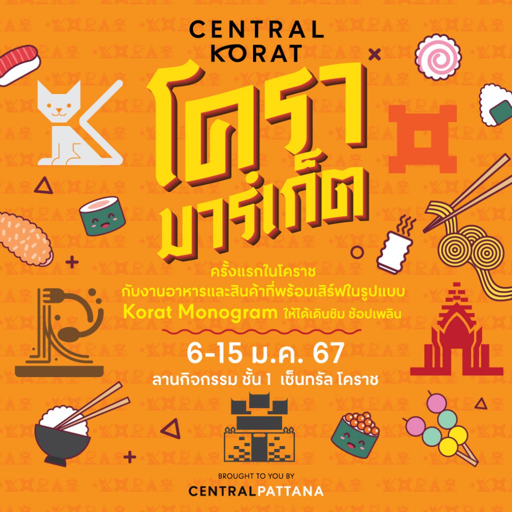 เซ็นทรัลโคราช ร่วมกับหอการค้านครราชสีมา เตรียมจัดงานผลักดัน Korat Monogram ต่อเนื่อง ในงาน “โครา มาร์เก็ต” งานอาหารและสินค้าที่พร้อมเสิร์ฟในรูปแบบ Korat Monogram กันแบบจัดเต็มตลอดทั้งงานไม่ว่าจะเป็นสินค้าและอาหารโคราชมากกว่า 30 ร้านค้า อาทิ ผัดหมี่โคราช ขนมจีน ก๋วยเตี๋ยว จากร้านครัวแม่ติ่ง, ขนมยุค 90's จากร้านขายอดีต 10.- , ขนมเบื้องบ้าบิ่น ทองม้วน ทองม้วนสด จากร้านขนมเบื้องป้าใหญ่, เกี๊ยวซ่า โอเด้ง จากร้าน BakeMeCheese, ขนมปังฮอกไกโด ขนมปัง ไดฟุกุ จากร้าน Mrs softbread, น้ำผลไม้สกัดเย็น จากร้าน Fruity health ,โมจิ ถังหูลู่ จากร้านดัง Mochi factory, จ๊อปู จ๊อกุ้ง และน้ำส้ม จากร้านจ๊อปู หลิน หลิน, ขนมเซาปิ่ง มินิเค้ก จากร้าน Mr.Saoping & Beloved Factory, น้ำผลไม้ปั่น จากร้าน Longdoodrink, แมลงทอด ข้าวหมาก จากร้าน มีแมลง, ลูกชิ้นปิ้ง ผัดไทย จากเจ๊หยงผัดไทยกุ้งสด VS ลูกชิ้นปิ้ง, ปากหม้อญวณ ถั่วแปบ จากร้าน บุษยาขนมไทย, ผลไม้ตามฤดูกาล สตอเบอร์รี่ ทุเรียน องุ่น จากร้าน Fruit Stories, ไข่ปลาหมึกย่าง จากร้าน ปุณภัช, ทอดมัน ปอเปี๊ยะ ลุยสวน จากร้าน ทอดมันกุ้งคุณนาย, เครื่องดื่มกาแฟ โกโก้ ชาไทย และชาเขียว จากร้าน Charg Phalang, ลูกชิ้นปิ้ง หมูและเนื้อ จากร้านลูกชิ้นนายพล, ลูกชิ้นปลาเยาวราช จากร้านลูกชิ้นปลานายเนส, อาหารทะเลแปรรูป จากร้านรุ่งลัดดา, จ๊อปู บ๊ะจ่าง หม้อแกง สัปปะรดภูแล จากร้าน นายเรียว, เสื้อผ้าคุณผู้หญิง จากร้าน คุนหมิง, เครื่องประดับ จากร้านทองหุ้มสุโขทัย
