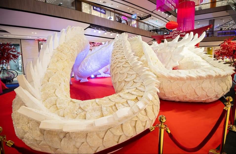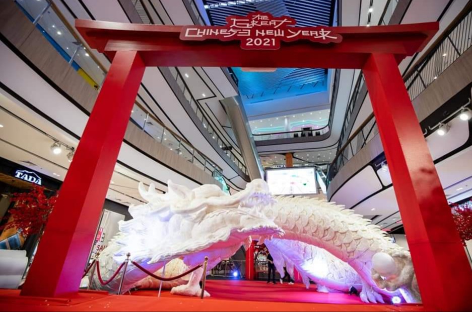 วันนี้ (11 ก.พ.) ผู้สื่อข่าวรายงานว่า ที่ ศูนย์การค้าเซ็นทรัลพลาซา นครราชสีมาได้มีการจัดงานตรุษจีนปีวัวทอง ใช้ชื่องานว่า “ CENTRAL KORAT THE GREAT CHINESE NEW YEAR 2021” อลังการตระการตากับ “ประติมากรรมมังกรเกลือ” โดยฝีมือคนไทย ซึ่งประติมากรรมมังกรเกลือมีความสูง 4 เมตร ลักษณะขดไป-มา รัศมีรอบวงกลม 12 เมตร ความยาวจากหัวไปท้ายประมาณ 35 เมตร ทำจากเกลือสมุทรเม็ดใหญ่โดยใช้จำนวนเกลือทั้งหมด 160 กิโลกรัม และใช้ระยะเวลาการทำทั้งหมด 27 วัน ซึ่งส่วนที่ทำยากที่สุดคือส่วนลำตัว ใช้เวลาประมาณ 20 วัน สำหรับส่วนหัวใช้เวลาประมาณ 2 วัน ซึ่งประติมากรรมมังกรเกลือ มีความหมายในศาสตร์ของชาวจีนเชื่อกันว่า “เกลือ” สามารถนำมาใช้ในการขับไล่สิ่งอัปมงคลออกไปได้ เป็นสิ่งที่ดึงดูดความโชคดีเข้าบ้าน ที่สำคัญเกลือนั้นยังใช้แก้ฮวงจุ้ยที่ไม่ดีได้ เช่น จะมีเกลือติดอยู่ที่ครัวเรือนเสมอ เพราะเกลือเหล่านี้จะช่วยดูดซับเชื่อโรคและความอับชื้น จะช่วยให้คนในบ้านแข็งแรง ไม่ค่อยเจ็บไข้ได้ป่วยนั่นเอง