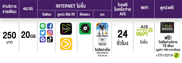 -    เล่นเน็ตเต็มสปีด 20 GB (จากนั้นเล่นเน็ตต่อเนื่องด้วยความเร็ว 128 Kbps.)
