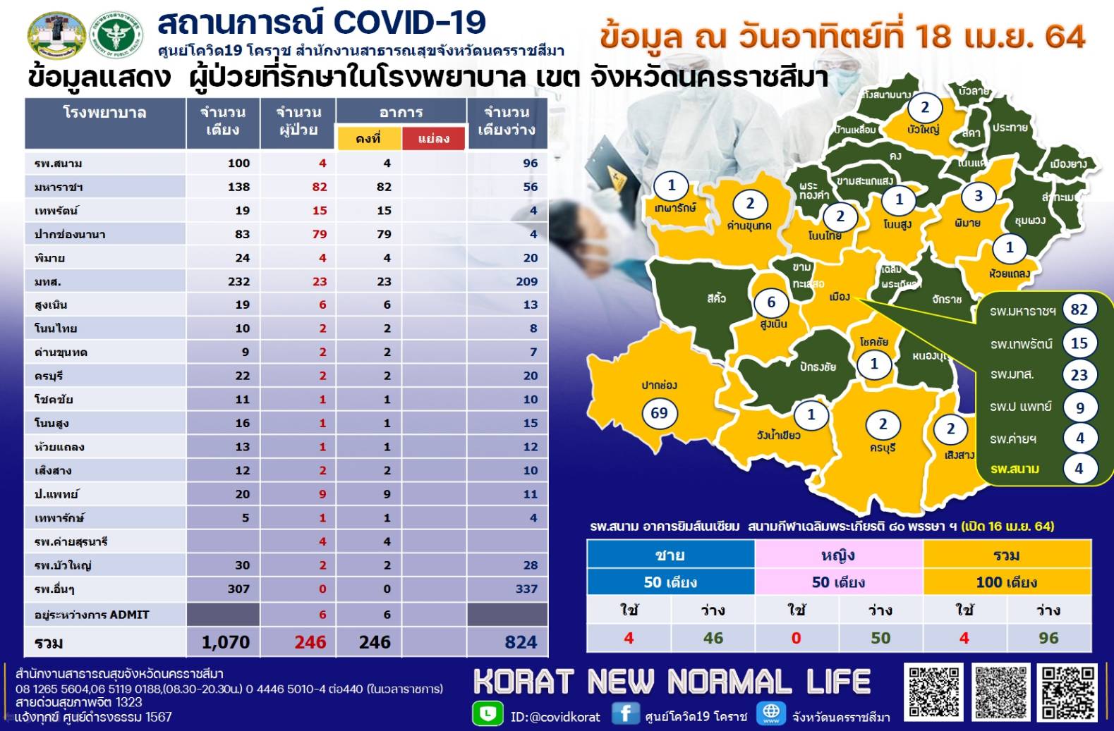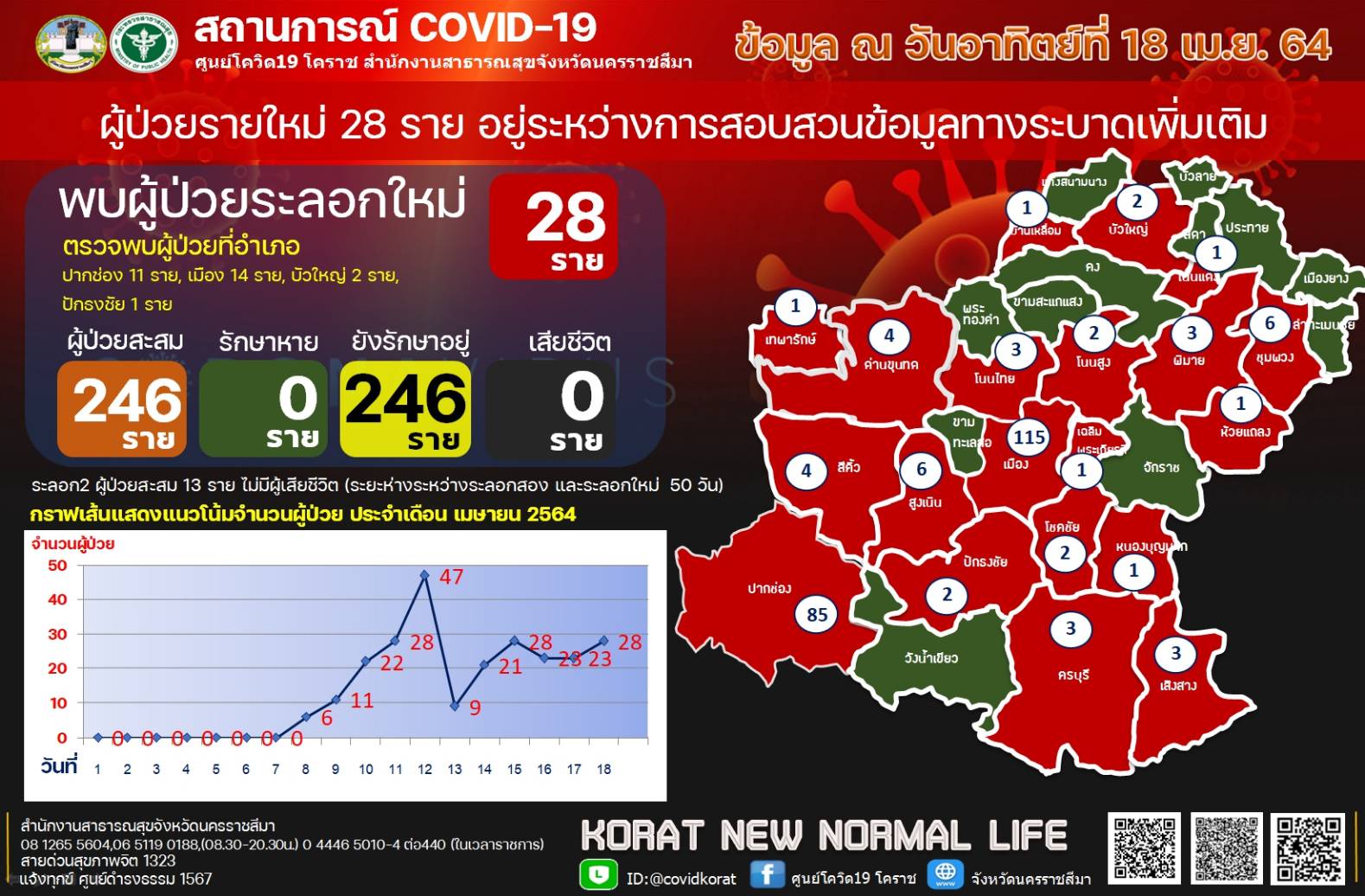 ล่าสุดวันนี้(18เม.ย.) พบผู้ป่วยรายใหม่เพิ่มอีก 28 ราย แบ่งเป็น อ.ปากช่อง11ราย เมือง14ราย บัวใหญ่2รายและปักธงชัย1ราย ยอดสะสมการระบาดโควิด-19เดือนเมษายน รวมจำนวน 246ราย ผู้ป่วยกระจายในพื้นที่20อำเภอ โดยอยู่ตามโรงพยาบาลต่างๆดังนี้ โรงพยาบาลสนาม 4 รายโรงพยาบาลมหาราชนครราชสีมา 82 ราย โรงพยาบาลเทพรัตน์นครราชสีมา 15 ราย โรงพยาบาลปากช่องนานา 79 รายเป็นคลัสเตอร์ปาร์ตี้วันเกิดพลู วิลล่า พิมาย 4 ราย มทส. 23 ราย สูงเนิน 6 รายโนนไทย 2 ราย ด่านขุนทด 2 ราย ครบุรี 2ราย โชคชัย1โนนสูง 1 ราย ห้วยแถลง 1ราย เสิงสาง 2 โรงพยาบาล ป. แพทย์ 9 ราย เทพารักษ์ 1ราย รพ.ค่ายสุรนารี4ราย บัวใหญ่2ราย อยู่ระหว่างการแอดมิด6ราย โดยผู้ป่วยอาการปอดติดเชื้อ 3 รายพักรักษาอยู่ที่โรงพยาบาลมหาราชนครราชสีมา อยู่ในความดูแลของแพทย์อย่างใกล้ชิด