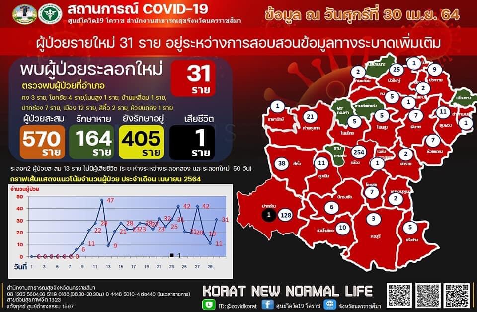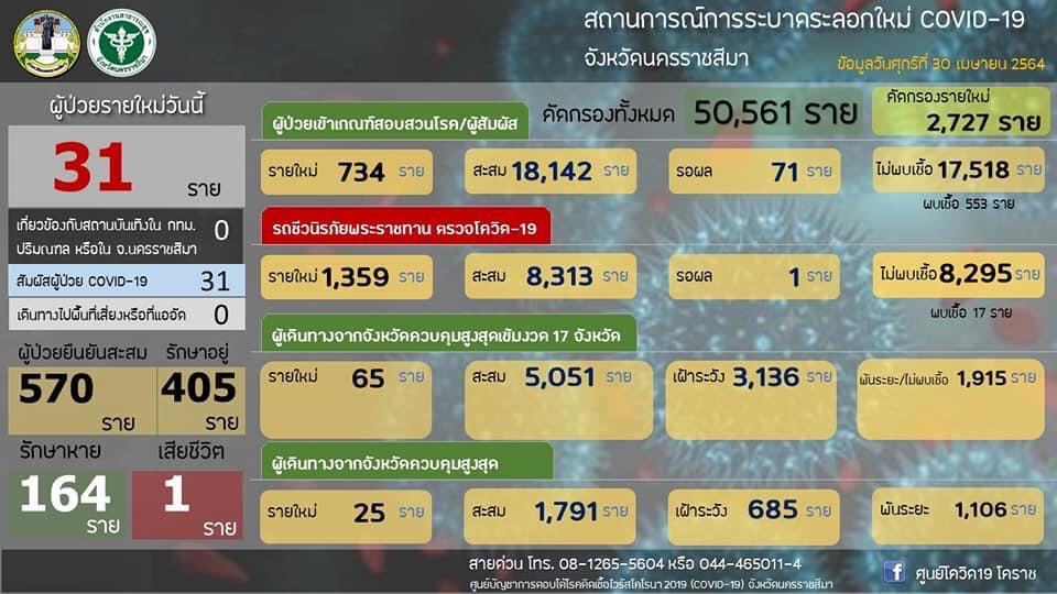 นพ.นรินทร์รัชต์ พิชญคามินทร์ นายแพย์สาธารสุขจังหวัดนครราชสีมา เปิดเผยถคงสถานการณ์การแพร่ระบาดโรคติดต่อเชื้อไวรัสโควิด-19 ในพื้นที่ 32 อำเภอว่า วันนี้พบผู้ป่วยรายใหม่จำนวน 31 ราย ในพื้นที่ อ.เมือง 12 ราย อ.คง 3 ราย อ.โชคชัย 4 ราย อ.โนนสูง 1 ราย อ.บ้านเหลื่อม 1 ราย อ.ปากช่อง 7 ราย อ.สีคิ้ว 2 ราย อ.ห้วยแถลง 1 ราย รวมสะสม 570 ราย เสียชีวิต 1 รายและรักษาหาย 164 ราย การดำเนินการค้นหาเชิงรุกเพื่อตัดวงจรการแพร่ระบาดโดยรถเก็บตัวอย่างชีวนิรภัยพระราชทานจำนวน 2 คัน ที่สนามหน้าศาลากลางจังหวัดนครราชสีมา อ.สีคิ้ว อ.สูงเนิน อ.ด่านขุนทด และ อ.บัวใหญ่ มีจำนวนผู้ตรวจคัดกรอง 8,313 ราย ติดเชื้อสะสม 17 ราย
