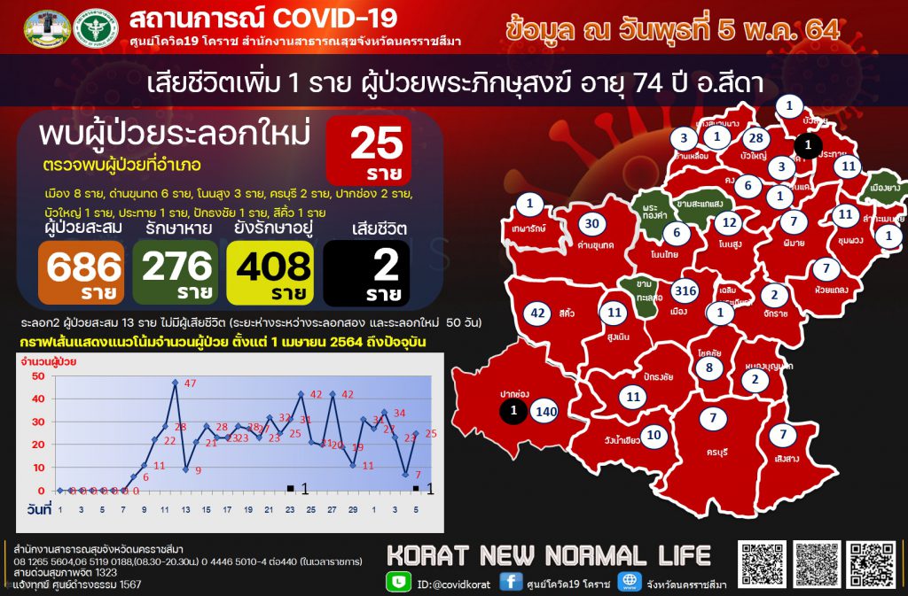 เผาแล้ว!  หลวงตาเหยื่อโควิด-19 รายที่ 2 ของโคราช  เศร้ารักษาแค่ 2 วันก็มรณภาพ  พบผู้ป่วยเพิ่มอีก 25 ราย ยอดสะสม 686 ราย ผู้ป่วยหนัก 26 ราย ส่วนใหญ่เป็นผู้สูงอายุ ผู้ว่าฯ ผ่อนผันให้ร้านสปาเปิดได้