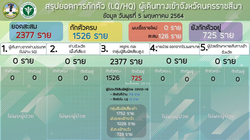 ช่วงสายวันเดียวกันนี้ที่ห้องประชุมสำนักงานการท่องเที่ยวและกีฬาจังหวัดนครราชสีมา อ.เมือง จ.นครราชสีมา  นายจรัสชัย  โชคเรืองสกุล รองผู้ว่าราชการจังหวัดนครราชสีมา พร้อมด้วย นพ.ชาญชัย บุญอยู่ รองนายกแพทย์สาธารณสุขจังหวัดนครราชสีมา และคณะกรรมการโรคติดต่อจังหวัดนครราชสีมา ร่วมกันแถลงข่าวสถานการณ์การแพร่ระบาดโควิด-19 ที่จังหวัดนครราชสีมาว่า ล่าสุดพบผู้ป่วยติดเชื้อรายใหม่เพิ่ม 25  ราย พบ ในพื้นที่ อำเภอเมือง 8 ราย ,ด่านขุนทด 6 ราย,โนนสูง 3 ราย,ครบุรี 2 ราย ปากช่อง 2 ราย บัวใหญ่ 1 ราย ประทาย 1 ราย ปักธงชัย 1 ราย สีคิ้ว 1 ราย พบผู้ป่วยใน 28 อำเภอ รวมผู้ป่วยสะสม  686 ราย หายป่วยสะสม 276 ราย เสียชีวิตเพิ่ม 1 ราย รวมเสียชีวิตสะสม 2 ราย คงเหลือรักษาตัว  408 ราย สำหรับข้อมูล รพ.สนาม มีผู้ป่วย 28 ราย แบ่งเป็นชาย 9 ราย หญิง 19 ราย คงเหลือเตียงว่างใน รพ.สนาม 172 เตียง